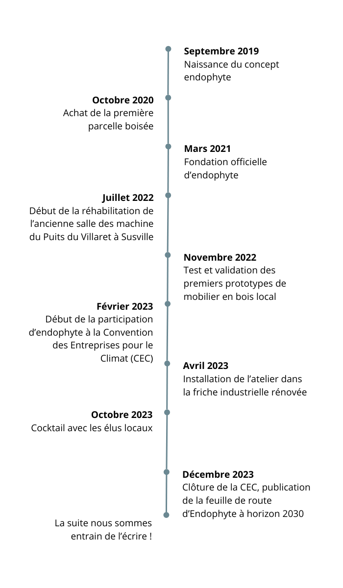 - Créer des réseaux de compétences : connecter artisans, forestiers, et acteurs locaux pour valoriser le savoir-faire régional.- Innover dans la gestion du cycle de vie du bois : réduire l’impact environnemental à chaque étape, grâce à des pratiques transparentes et durables.- Inspirer un modèle reproductible : faire d’Endophyte un exemple à suivre, applicable dans d’autres territoires.