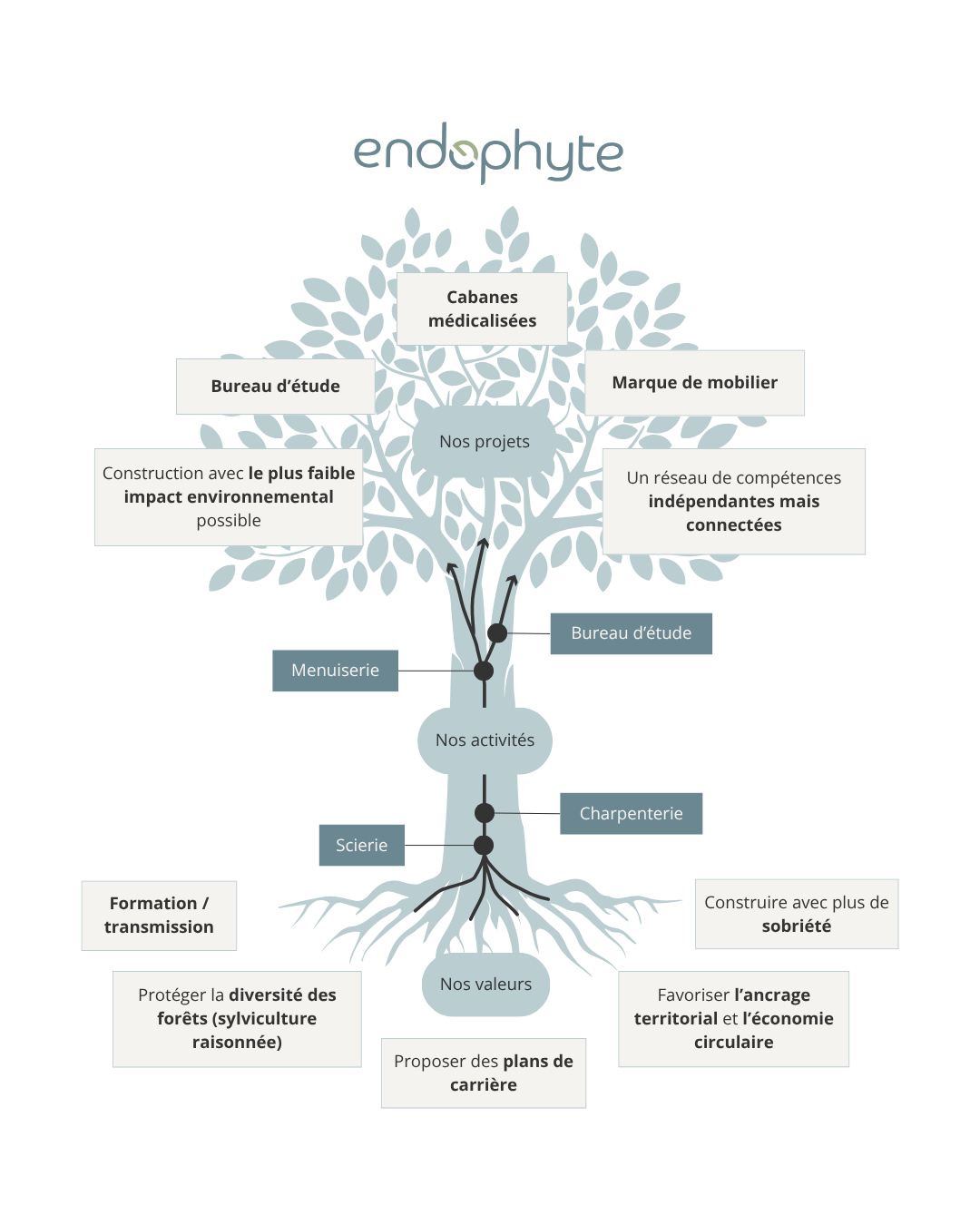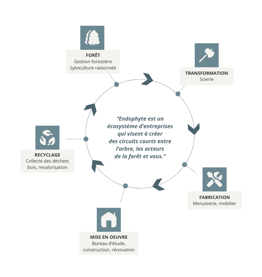 « Bonjour, je m’appelle Philippe et j’ai décidé de quitter un travail agréable et confortable pour créer l’initiative ENDOPHYTE.* ENDOPHYTE signifie littéralement « à l’intérieur d’un végétal » et désigne les échanges symbiotiques entre deux organismes. Plus qu’une société ou une marque, c’est la volonté d’être en symbiose avec notre écosystème, ce bien commun que l’on doit protéger.** ENDOPHYTE est née de la volonté de rapprocher les arbres, les acteurs de la filière et les utilisateurs finaux dans une démarche raisonnée et vertueuse.*A contrario d’initiatives similaires, je suis passé à l’acte pour vous garantir que 100% de nos produits ou services sont issus de votre territoire, emploient votre entourage, et émettent le moins de carbone possible. »